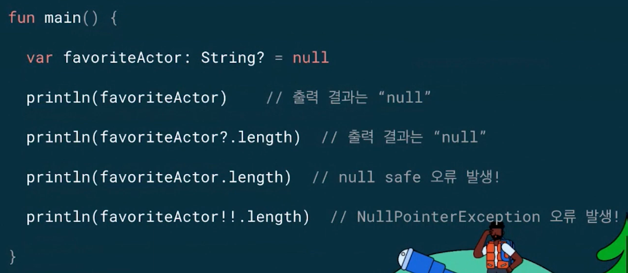 변수 선언 단계에서 null이 가능한지 아닌지를 같이 선언