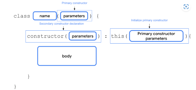 - 보조 생성자. 한 클래스에 여러 보조 생성자가 있을 수 있습니다. 매개변수를 포함하거나 포함하지 않고 보조 생성자를 정의할 수 있습니다. 보조 생성자는 클래스를 초기화할 수 있으며 초기화 로직을 포함할 수 있는 본문을 가집니다. 클래스에 기본 생성자가 있는 경우 각 보조 생성자는 기본 생성자를 초기화해야 합니다.