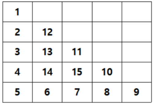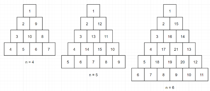 정수 n이 매개변수로 주어질 때, 다음 그림과 같이 밑변의 길이와 높이가 n인 삼각형에서 맨 위 꼭짓점부터 반시계 방향으로 달팽이 채우기를 진행한 후, 첫 행부터 마지막 행까지 모두 순서대로 합친 새로운 배열을 return하는 문제이다.