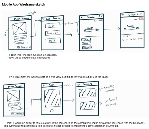 아래는 아이디어 구체화 과정 중 모델링을 위한 컴포넌트 다이어그램과 모바일 앱의 와이어프레임이다.