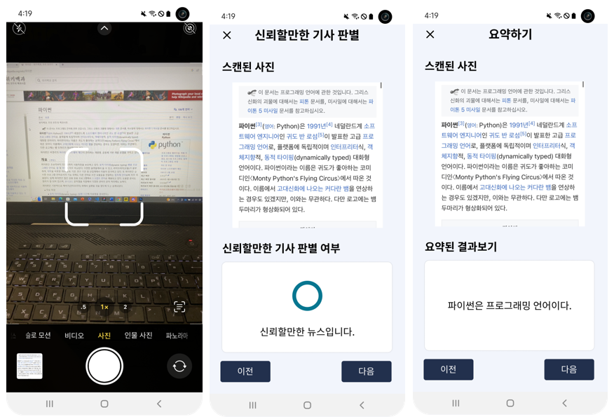 '뉴스 살펴보기' 기능은 사용자가 뉴스를 카메라로 찍게 되면 해당 기사가 신뢰할 만한 기사인지 판별해 주고 요약된 결과를 제공해 준다. 뉴스 기사 신뢰도 판별과 요약 결과 제공에서 ML 모델을 사용하였다.