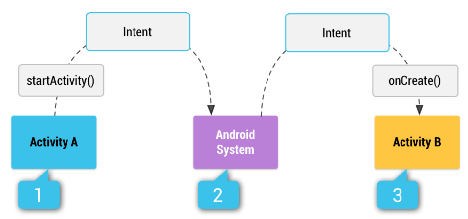 - 액티비티 A가 작업 설명이 있는 Intent를 생성하여 이를 startActivity()에 전달