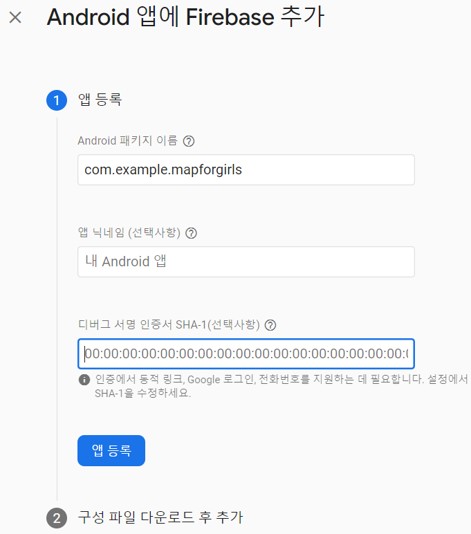 Android 패키지 이름(일반적으로 패키지 이름은 앱 수준 build.gradle 파일의 applicationId임)과 SHA-1 키를 입력해 준다.